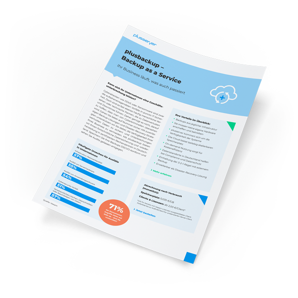 plusbackup ist das cloudbasierte Backup „Made in Germany“: DSGVO-konform, flexibel skalierbar und betrieben in zertifizierten deutschen Rechenzentren – inklusive georedundanter Zweitkopie mit Immutability.