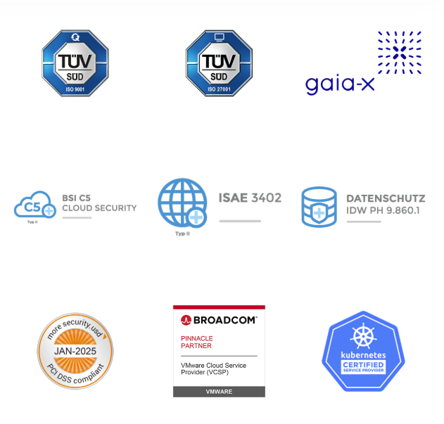 Vertrauen Sie auf höchste Sicherheit in unseren zertifizierten Rechenzentren in Deutschland. Als Gaia-X-Gründungsmitglied, VMware Sovereign Cloud Provider und Anbieter mit BSI-C5-Testierung bieten wir Ihnen zukunftsfähige Compute-Plattformen, die Ihre Souveränität und Innovationskraft in den Mittelpunkt stellen.